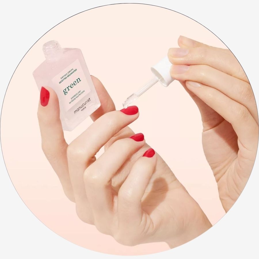 Une simple goutte par ongle, déposée en fin de manucure, suffit pour obtenir un séchage express, un fini net et un contour d’ongle plus souple et confortable.